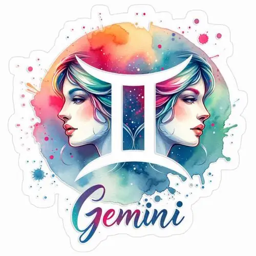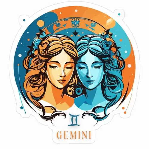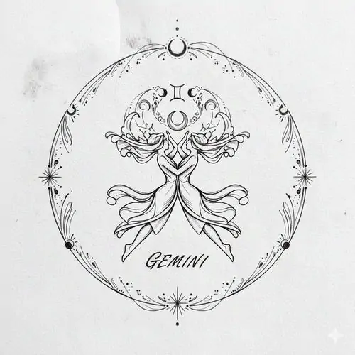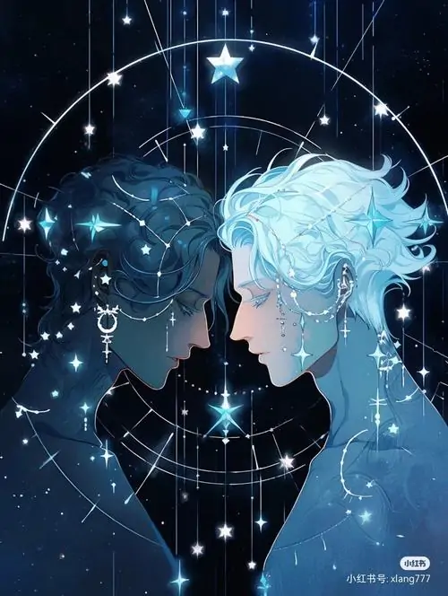Hình Song Tử nữ nhỏ bé xuất hiện thành hai bóng xanh đậm và xanh nhạt nhìn nghiêng dưới vòng sao, nét tối giản và nền đêm sâu khiến bố cục rất gọn mà vẫn dễ nhận ra Gemini