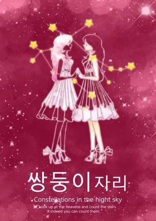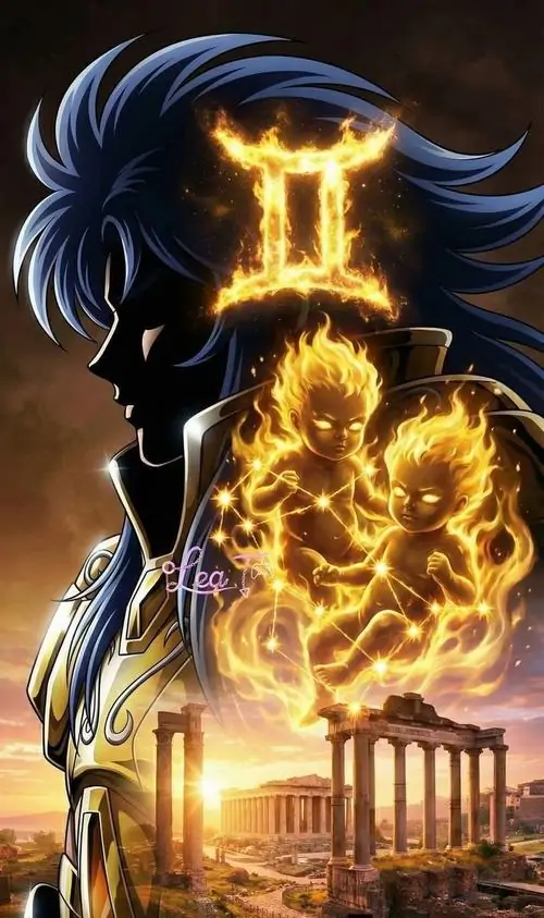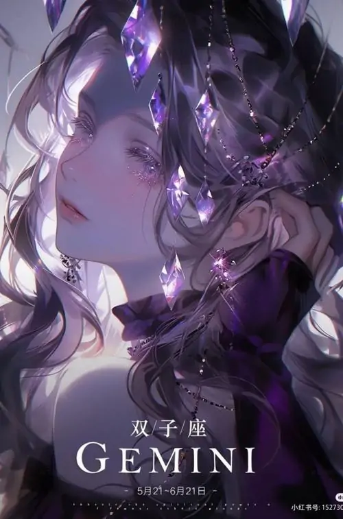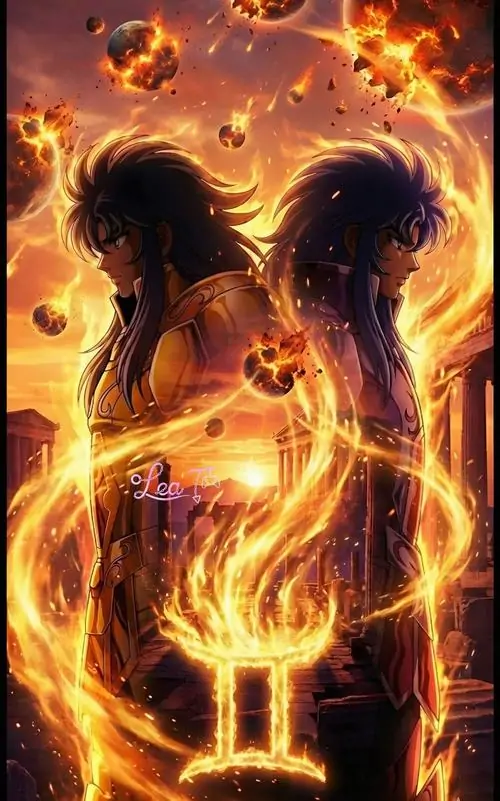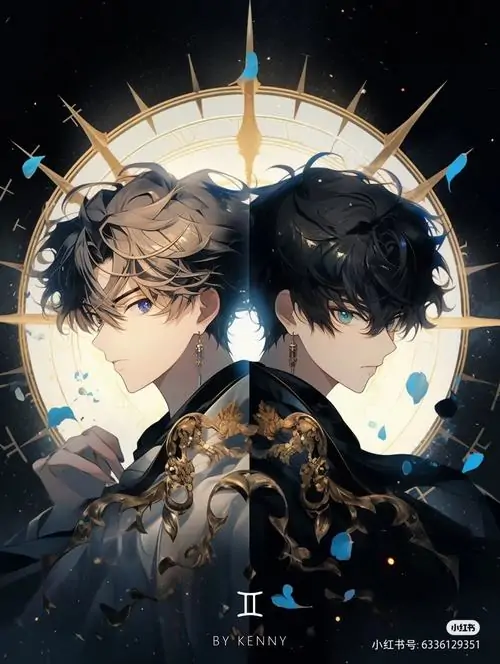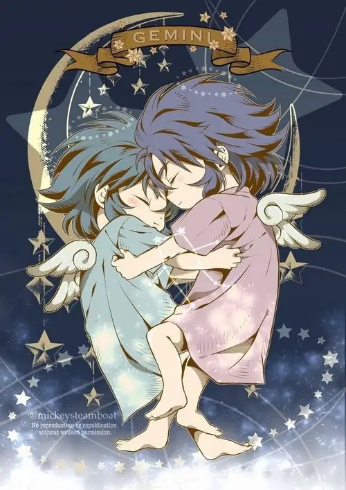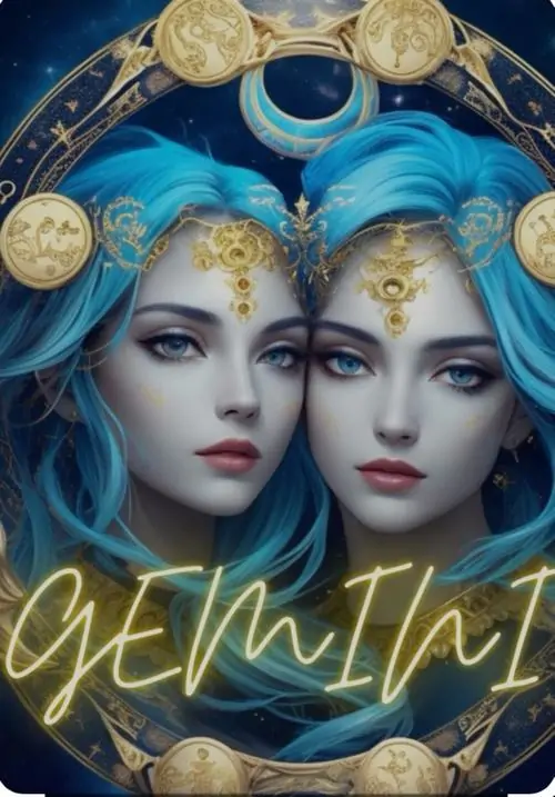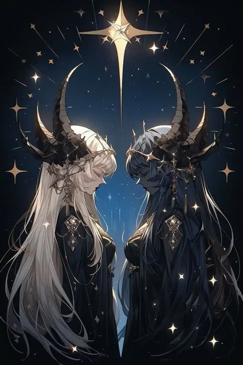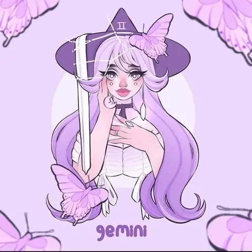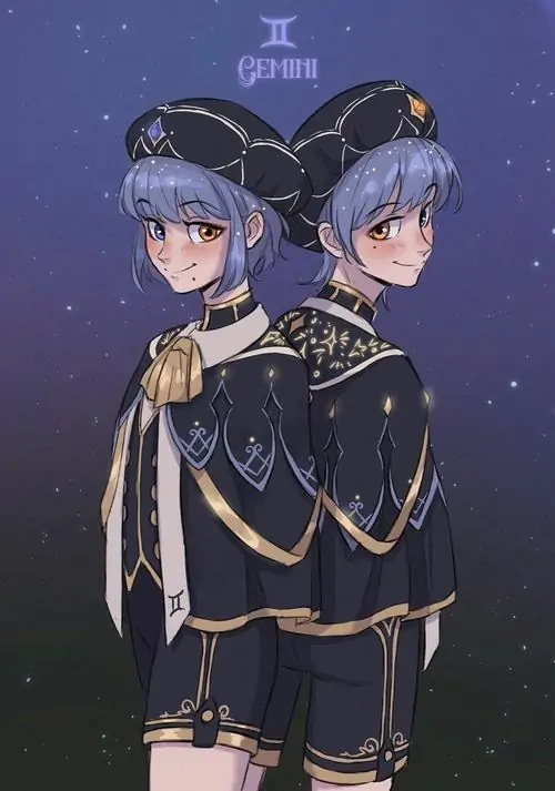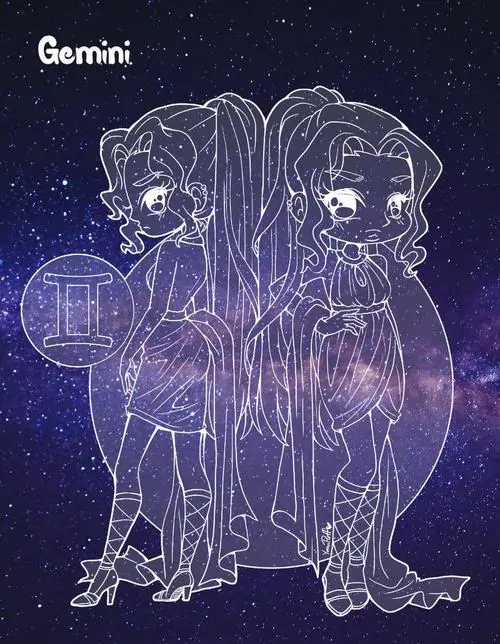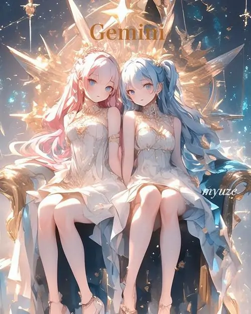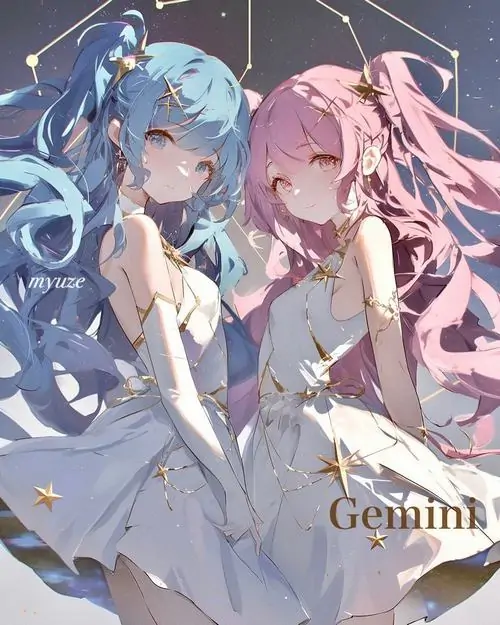 Hai nhân vật nữ xoay người đối diện quanh ký hiệu Gemini phát sáng, tà váy tím xanh cuộn như gió đêm khiến hình vẽ nhân vật Song Tử phong cách Nhật Bản trông bay bổng và khá ngầu