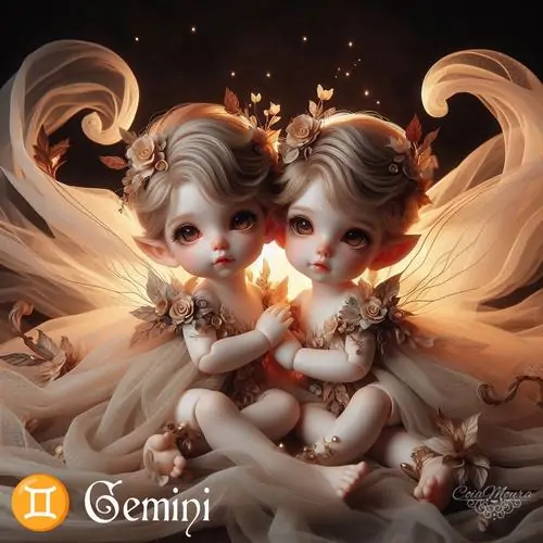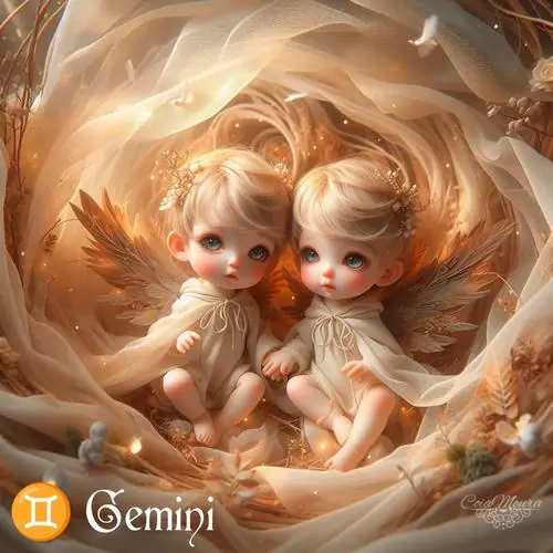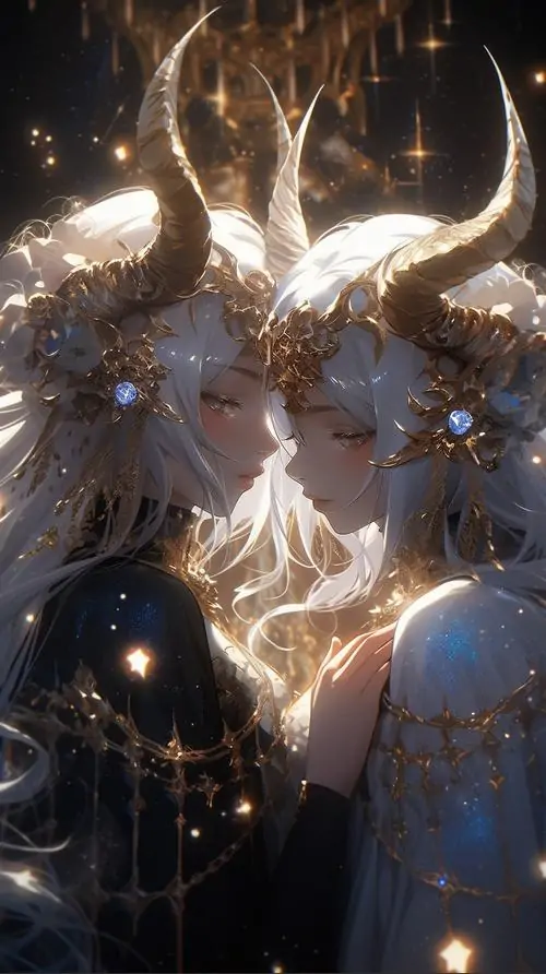 Ảnh nghệ thuật chibi cung hoàng đạo thứ ba đưa vào đôi hươu ánh vàng đội gạc lớn, thân xoay đối diện trong bóng tối nên cảm giác thiên về biểu tượng Gemini hơn hình người, nhìn khá lạ