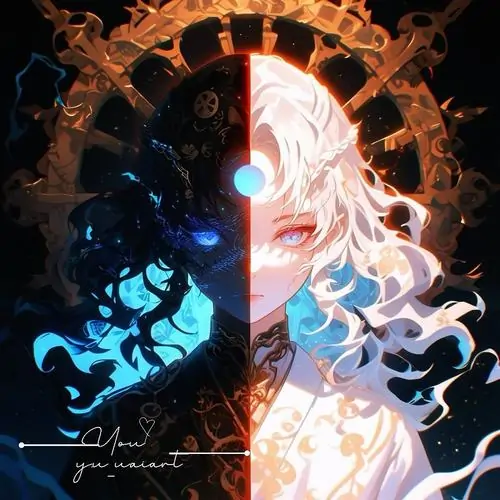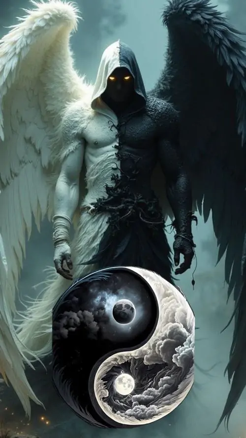 Ảnh cô nàng Song Tử hoạt hình chuyển sang nhân vật áo choàng tối ôm quả cầu âm dương, đôi cánh bạc mở rộng phía sau khiến khung hình có độ ngầu rõ rệt và khác hẳn các tranh mềm