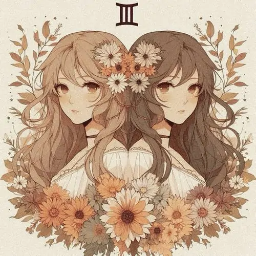 Ảnh cô nàng Song Tử hoạt hình trong tranh tông kem mang gương mặt hiền, tóc nâu xoã nhẹ và vòng hoa cúc trước ngực, bố cục đối xứng giúp cả đôi nhìn dịu và đẹp theo kiểu thơ
