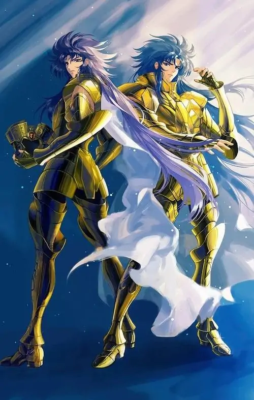 Hai nhân vật xanh vàng ôm lấy nhau giữa nền trời sáng, cơ thể kéo dài theo kiểu fantasy hơn anime thường thấy nên khung này hợp ai thích hình minh họa cô gái Song Tử nhỏ xinh phá cách