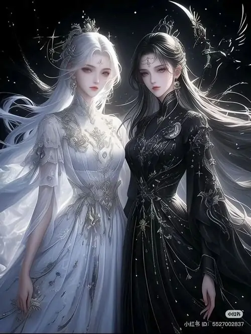 Cặp nhân vật nữ tóc dài trắng và đen đứng trước nền tối, váy ren rơi thẳng và gương mặt nghiêm làm ảnh cô nàng Song Tử hoạt hình này đẹp kiểu trưởng thành, hơi lạnh mà vẫn hút mắt