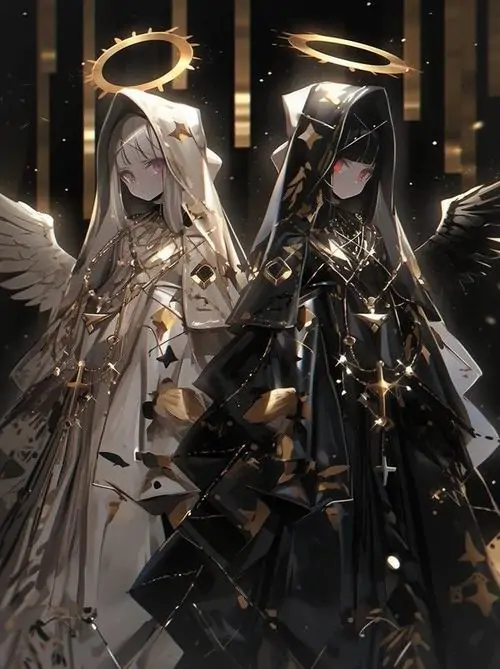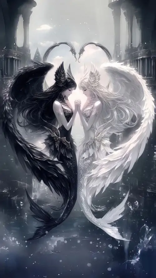 Hai thiên thần một trắng một đen dang cánh giữa mưa sáng xám bạc, dáng đứng đối lưng và phần váy dài rủ xuống làm không khí ảnh nặng hơn, hợp kiểu anime fantasy hơn chibi