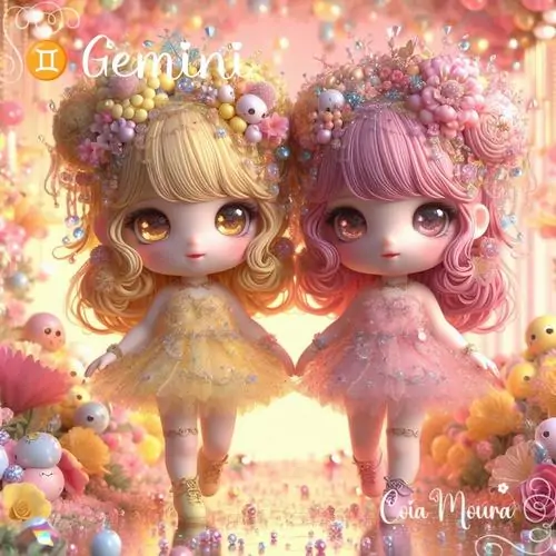 Cặp búp bê chibi tóc vàng và hồng đứng cạnh nhau giữa nền kẹo ngọt, váy phồng nhiều lớp cùng đôi mắt tròn khiến hình Song Tử nữ nhỏ bé này cute như món đồ sưu tầm