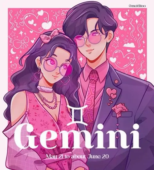 Tấm minh họa hồng tím vẽ cặp đôi đeo kính đứng sát vai, người nữ mỉm cười tươi và ký hiệu Gemini đặt giữa tạo cảm giác trẻ, vui, hợp làm ảnh đại diện cực chất