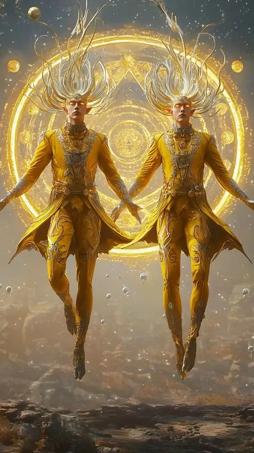 Ảnh avatar hai cô gái Song Tử đứng cạnh nhau trong váy sáng lấp lánh, tóc dài buông mềm và ánh nhìn hiền, khung dọc phủ sắc vàng làm tổng thể đẹp như tranh cung hoàng đạo