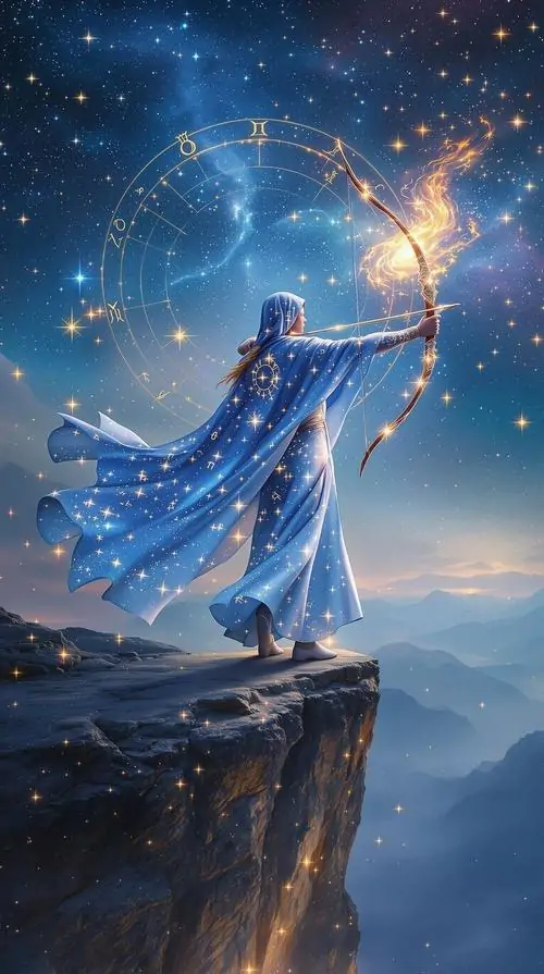 Nhân vật áo choàng xanh bước trên mỏm đá cao, cây cung ánh sáng nối lên chòm sao phía trước, khung hình rộng gợi cảm giác hình vẽ Sagittarius mini đang đi giữa đêm lạnh