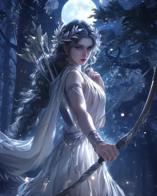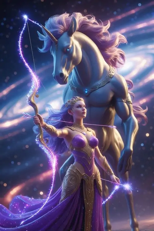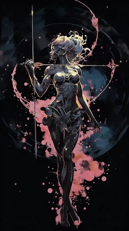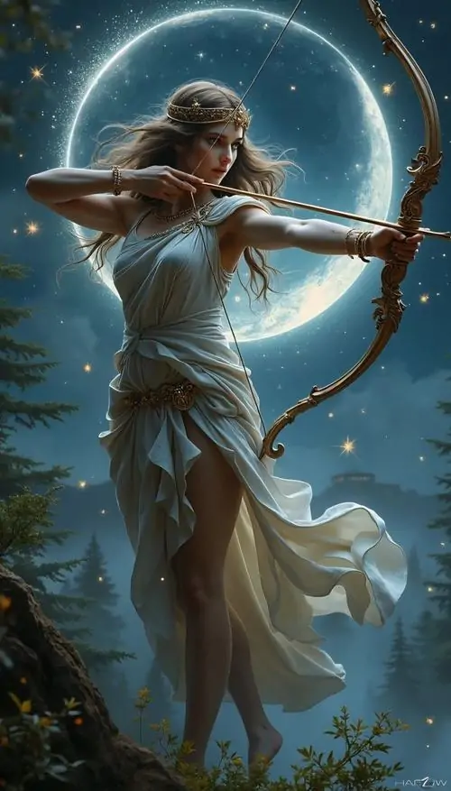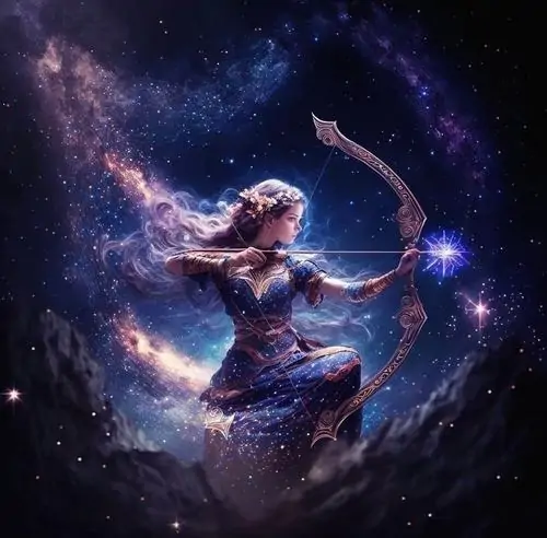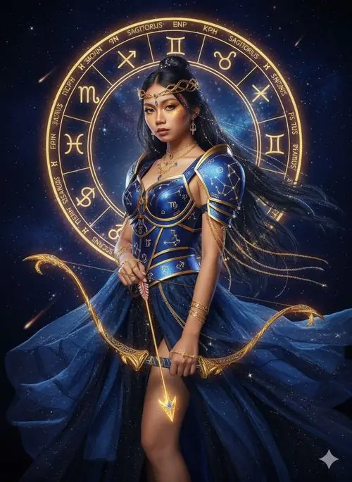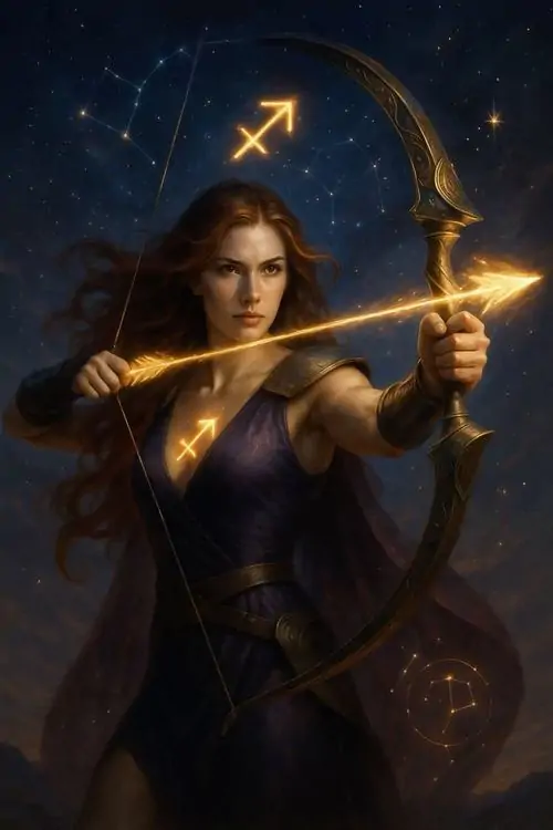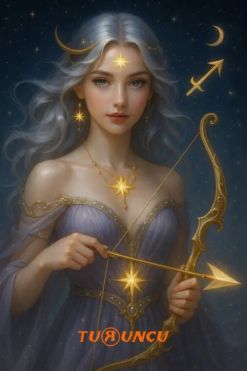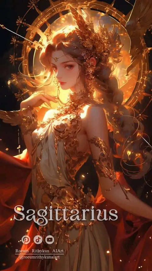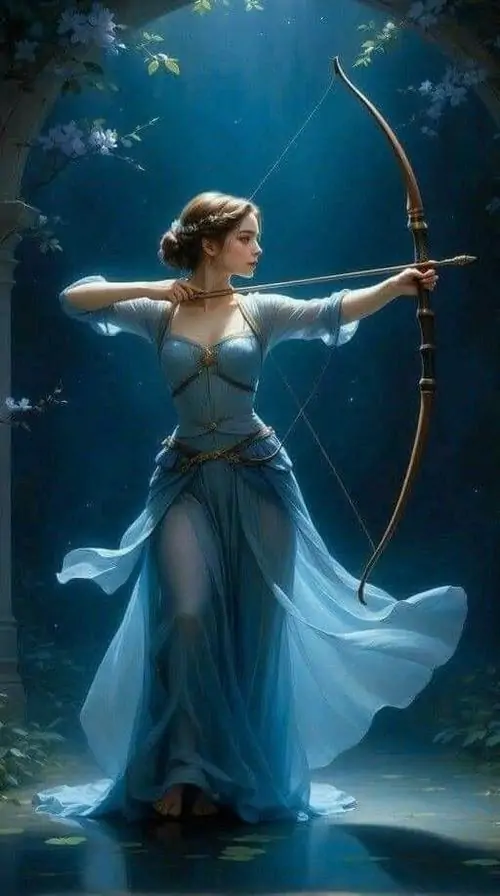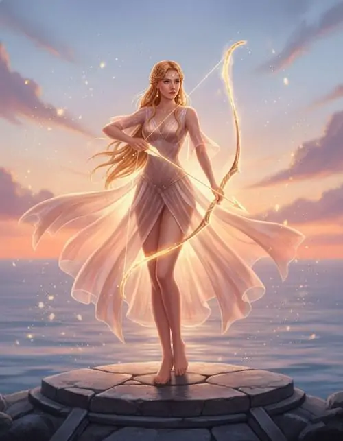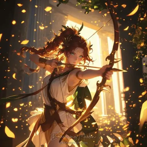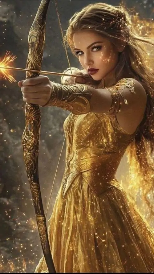 Người phụ nữ tóc vàng mặc đầm vàng ánh kim đứng giữa nền nâu ấm, tay giữ cung gỗ và mắt nhìn nghiêng bình tĩnh, bức này thiên về thần thoại hơn là avatar Nhân Mã anime
