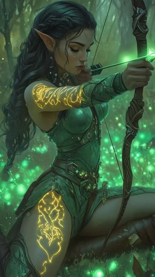 Cô gái elf trong bodysuit xanh ôm sát kéo cung giữa rừng tối, ánh sáng xanh hắt lên gò má và cánh tay làm khung dọc này nghiêng hẳn sang kiểu cung thủ anime ngầu, lạnh và gắt