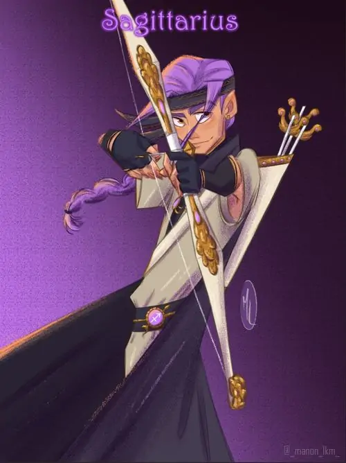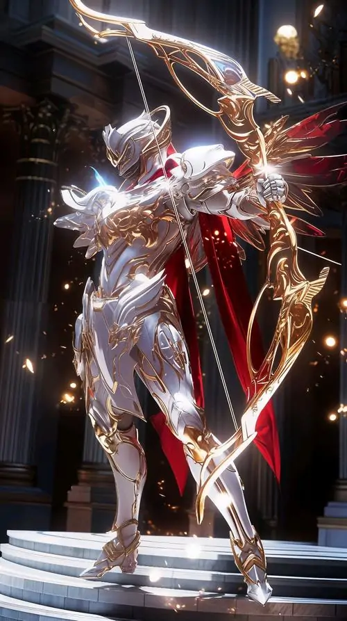 Nhân vật mặc giáp vàng đứng giữa vầng sáng lớn như cửa đền, một tay dựng cung thẳng và áo choàng đổ nếp dày, khung này khiến hình vẽ Sagittarius mini trông sang và rất nổi