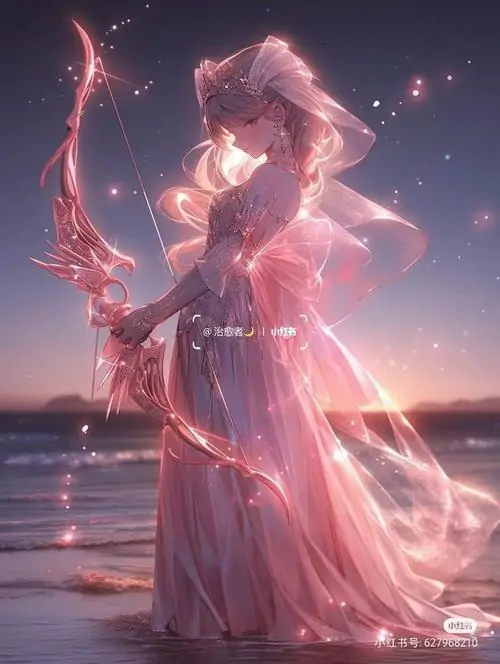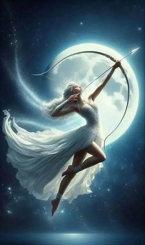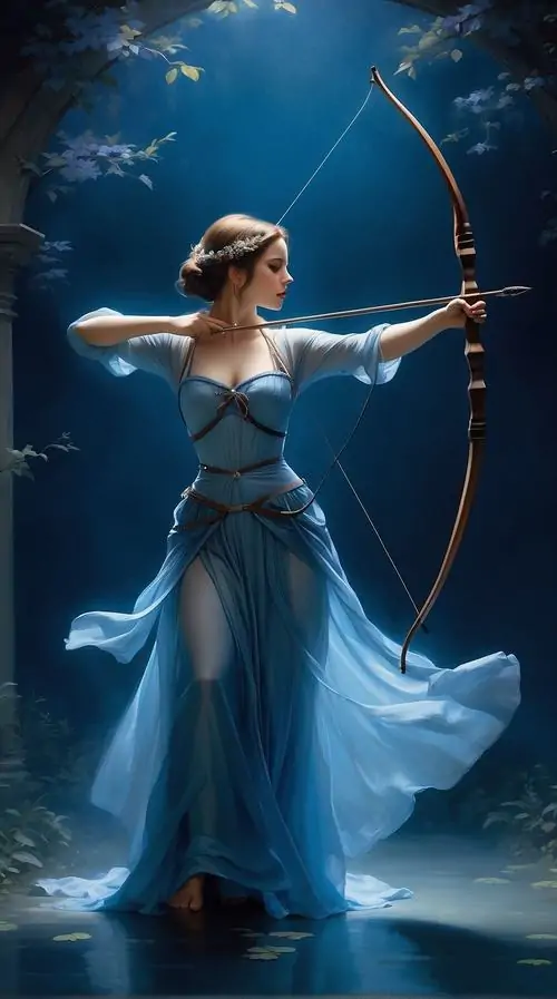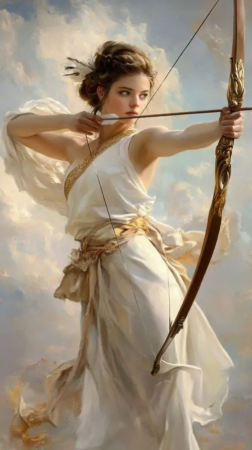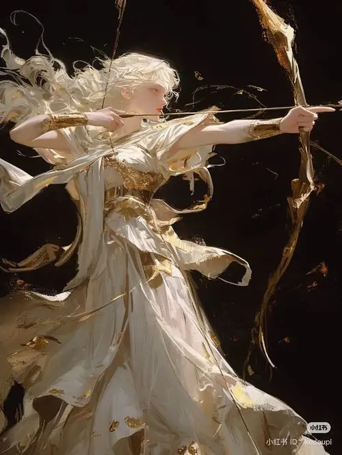 Thiếu nữ tóc vàng trong váy trắng quay nửa người dưới nền trời xanh nhạt, bàn tay thả lỏng bên cây cung mảnh, bức hình mang nhịp yên và hợp làm hình đại diện Nhân Mã tí hon