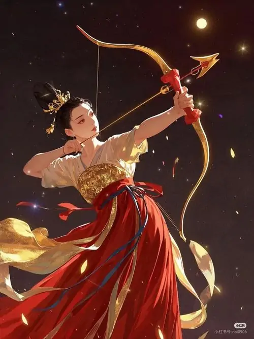 Ảnh profile cô gái mặc hán phục đỏ đứng chính diện trong sân điện, tay cầm cung và bó tên sau lưng, thần sắc tươi mà dứt khoát khiến tranh cung thủ nữ này trông vừa đẹp vừa rắn rỏi