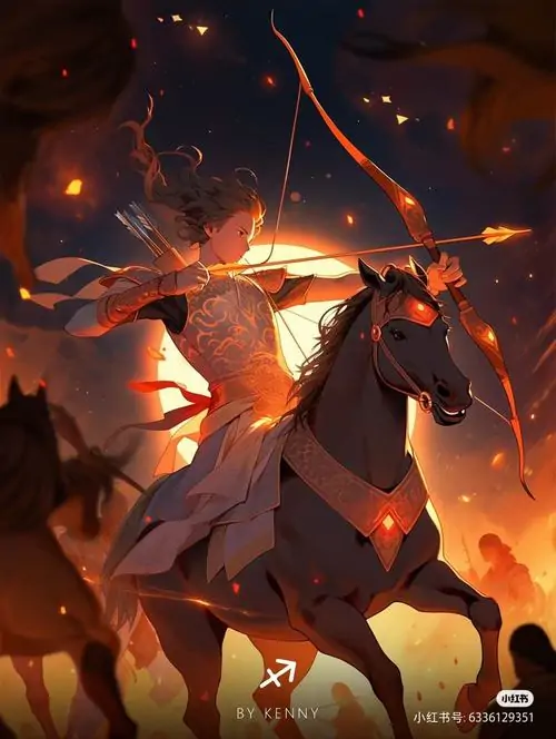 Hình đại diện cô gái áo cam nâu ngẩng mặt trong quầng sáng lửa, tóc buông dày và cây cung chìm giữa các vòng sáng, cảm giác như ảnh hoạt họa cung Nhân Mã bé xíu bản trưởng thành