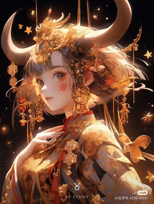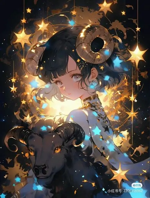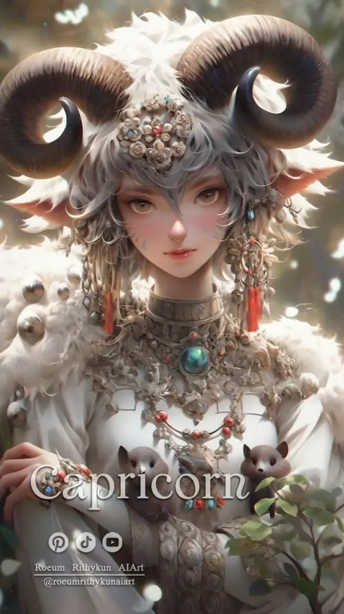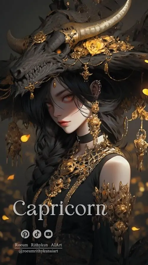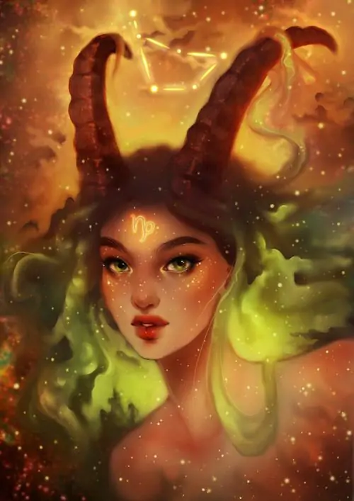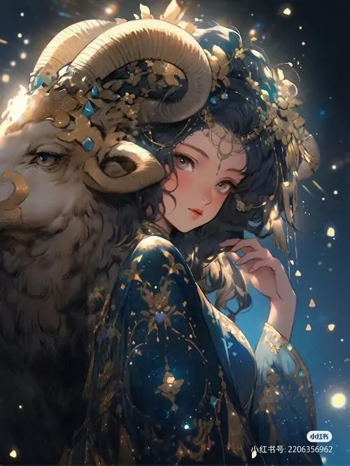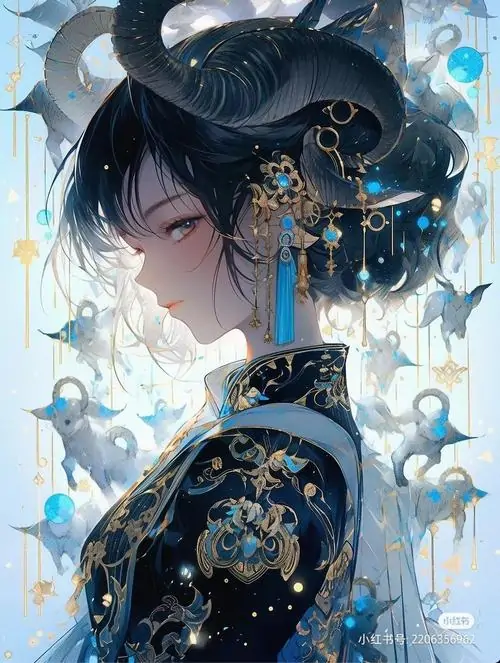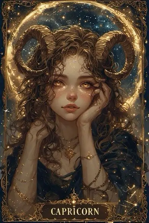 Thiếu nữ tóc nâu rối nhẹ chạm tay lên má, cặp sừng lớn phủ ánh vàng và nền họa tiết cổ làm bức tranh mang vẻ sang, hợp nhóm thích hình vẽ hoạt hình Ma Kết