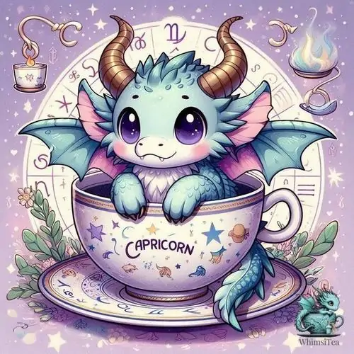 Linh vật nhỏ ngồi trong tách trà tím với tai cánh và sừng pastel, xung quanh đầy sao cùng mặt trăng nên nhìn như một ảnh nhân vật Ma Kết mini vừa lạ vừa đáng yêu
