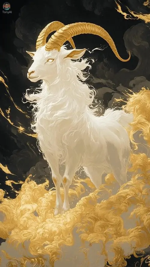 Hình dọc con dê trắng đứng vững trên đám mây vàng, bộ lông sáng và cặp sừng cong cao khiến bức này hợp làm hình nền cung hoàng đạo theo tông ấm rất đẹp