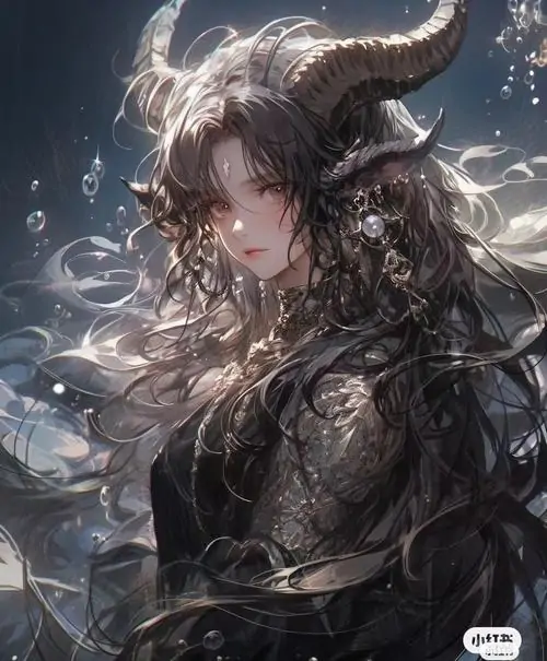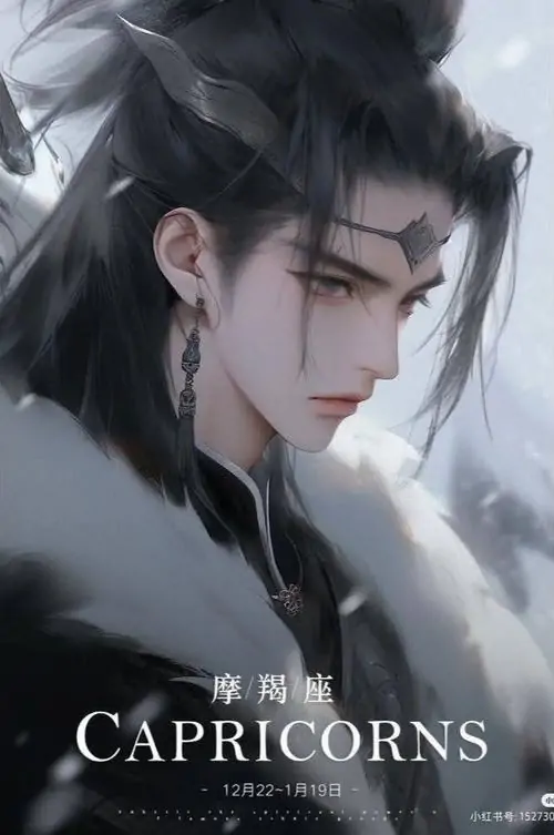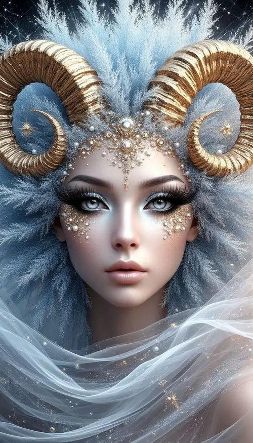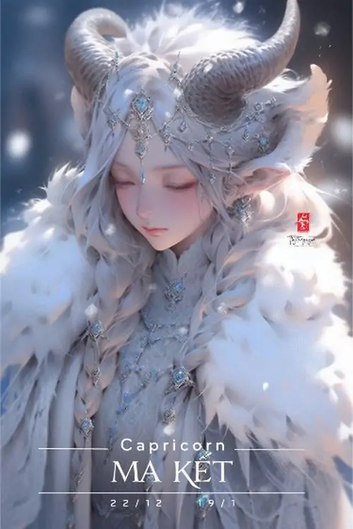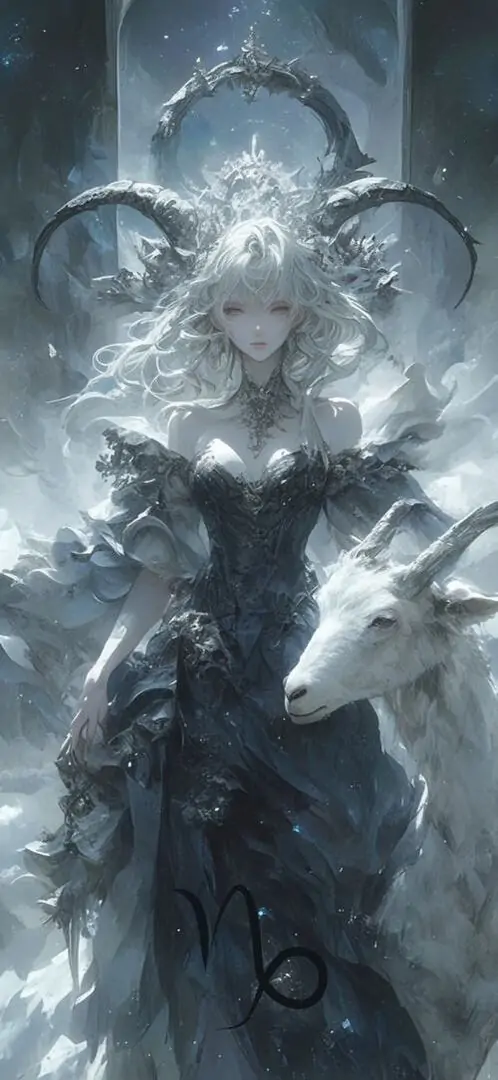 Ảnh chân dung nhân vật tóc đen xanh ngoái nhìn qua vai, cặp sừng đen dày nổi bật giữa nền băng tuyết giúp bức này lên chất Ma Kết nữ ngầu mà vẫn mềm