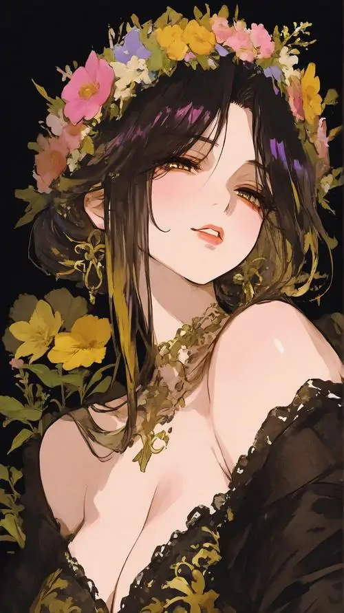 Thiếu nữ đội vòng hoa vàng nghiêng vai trên nền đen, làn da sáng và váy hở vai khiến ảnh trông mềm như tranh sách, hợp kiểu ảnh đại diện dễ thương mà vẫn đẹp