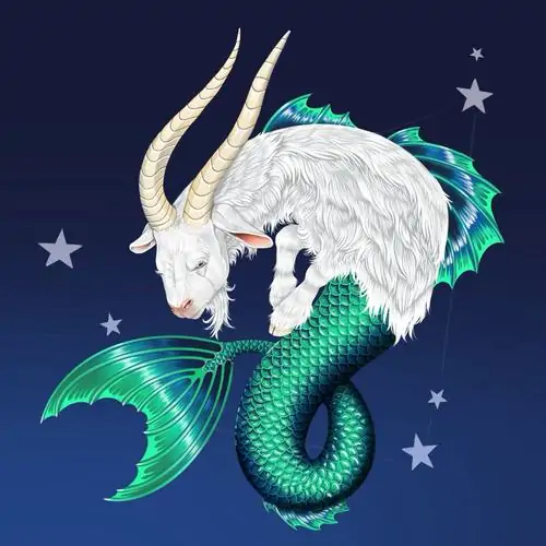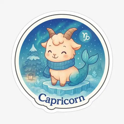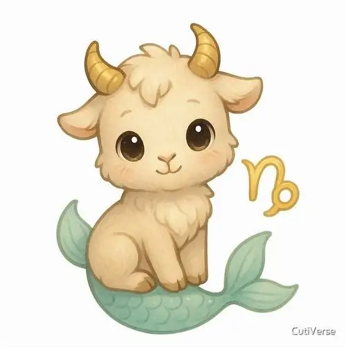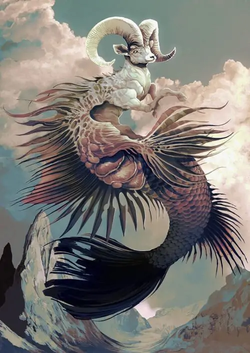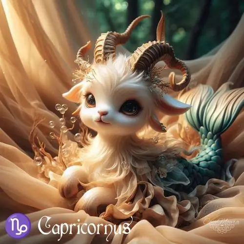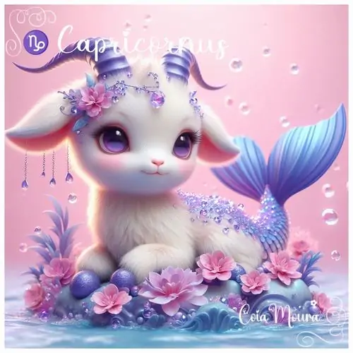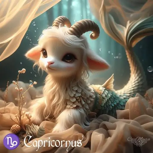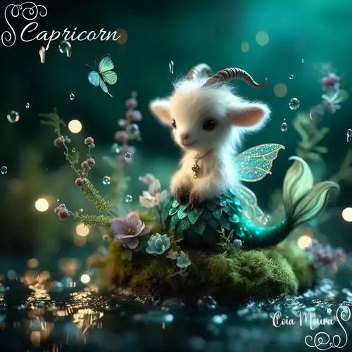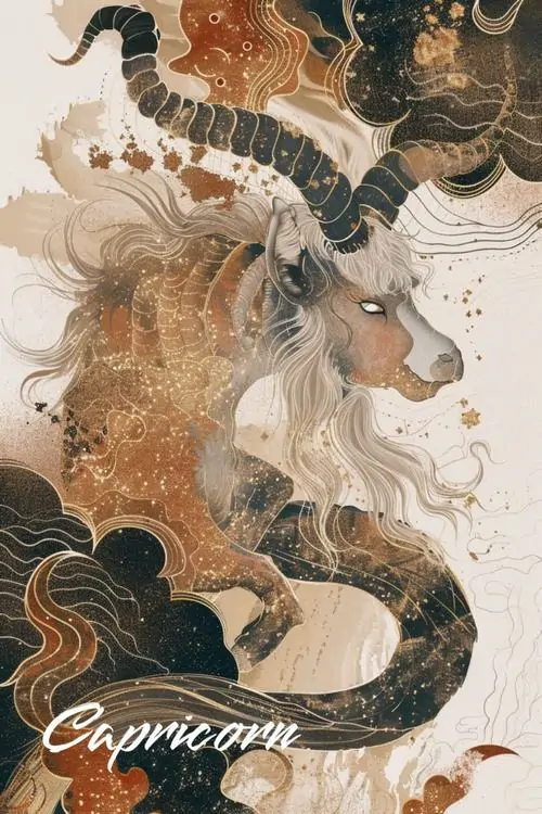 Sinh vật dê biển cuộn mình trên nền tranh loang màu cát, phần thân phủ lông mềm còn chiếc đuôi vút cong như sóng, khung vẽ này gợi đúng tinh thần biểu tượng chiêm tinh của Ma Kết