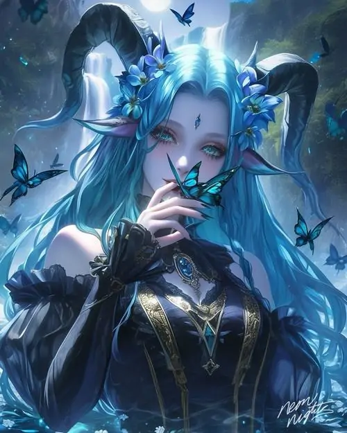 Bức hình tông lạnh cô gái tóc xanh lam đưa tay gần môi, mắt nhìn lệch và cặp sừng nhỏ phát sáng khiến tổng thể vừa ma mị vừa xinh kiểu tranh vẽ kỹ thuật số
