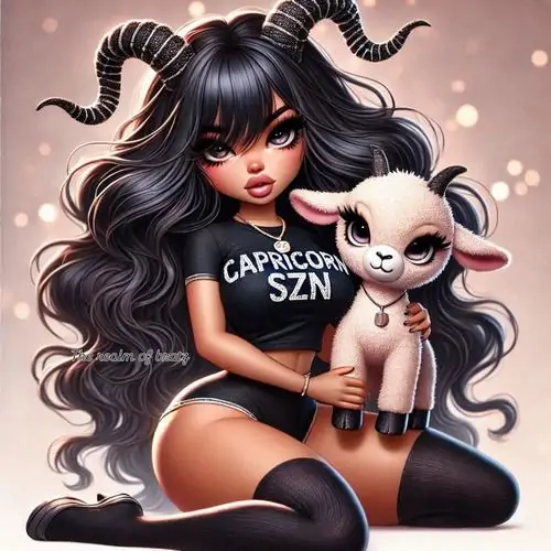 Ảnh nữ Ma Kết cô bé da nâu ngồi bệt ôm búp bê trắng, mái tóc đen xoăn xù và sừng dày cong ra hai bên khiến cả ảnh vừa cute vừa hơi tinh nghịch