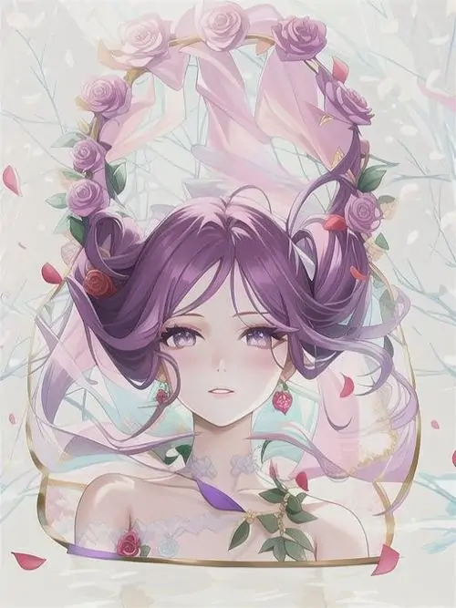 Khung hình cổ tích gương mặt chibi tóc tím hồng hiện lên giữa vòng hoa pastel, mắt tròn long và làn tóc bồng khiến ảnh mang đúng cảm giác phụ kiện tóc mềm xốp dễ thương