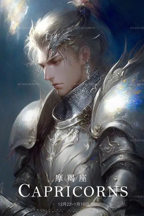 Chàng trai mặc giáp bạc quay nghiêng dưới ánh xanh, mái tóc ngắn sáng và đường quai hàm rõ khiến bức này thành phiên bản nhân vật anime Ma Kết trông đẹp và vững