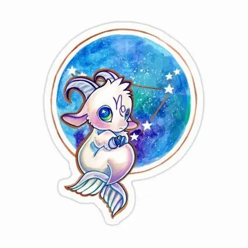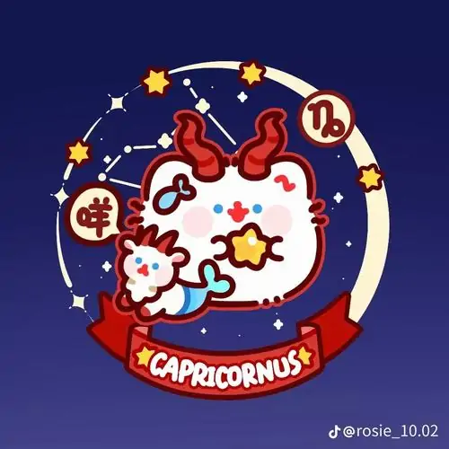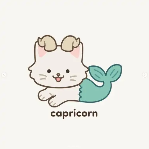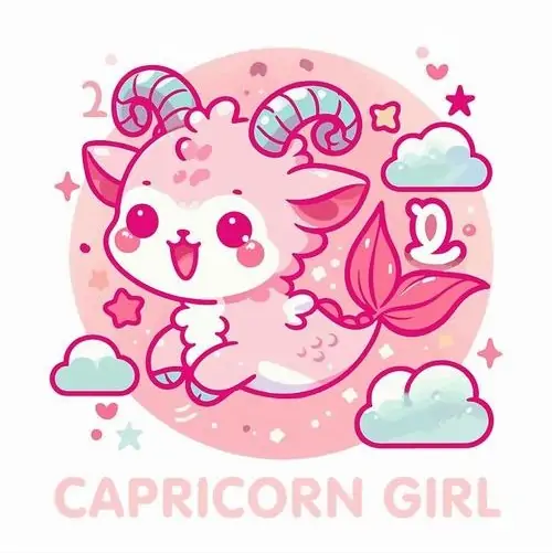 Nhân vật đầu tròn má hồng ngồi giữa nền xanh biển có chữ Ma Kết, cặp sừng nhỏ và váy pastel khiến đây thành ảnh chibi cung chiêm tinh nhìn một cái là thấy cute