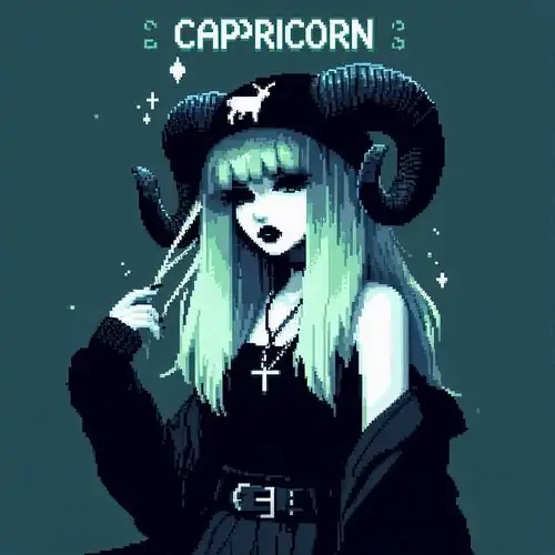 Nhân vật nữ tóc be đứng thẳng giữa khung trắng, tay khép trước váy và ký hiệu Ma Kết đặt dưới chân làm bức này giống đồ họa kỹ thuật số tối giản, sạch và đẹp