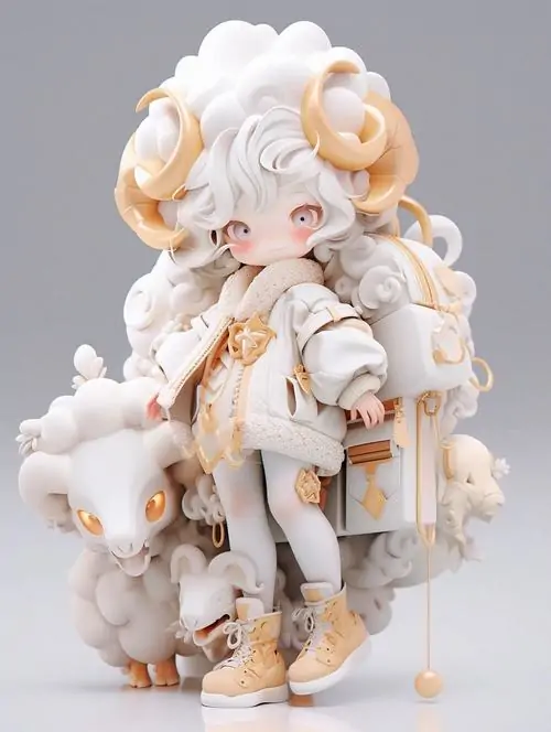 Bé chibi tóc vàng kem ngồi gọn với cặp sừng xoắn và váy nâu nhạt, hai má hồng cùng đôi tay bé xíu làm nổi bật phần bàn tay nhỏ xíu cực kỳ dễ thương