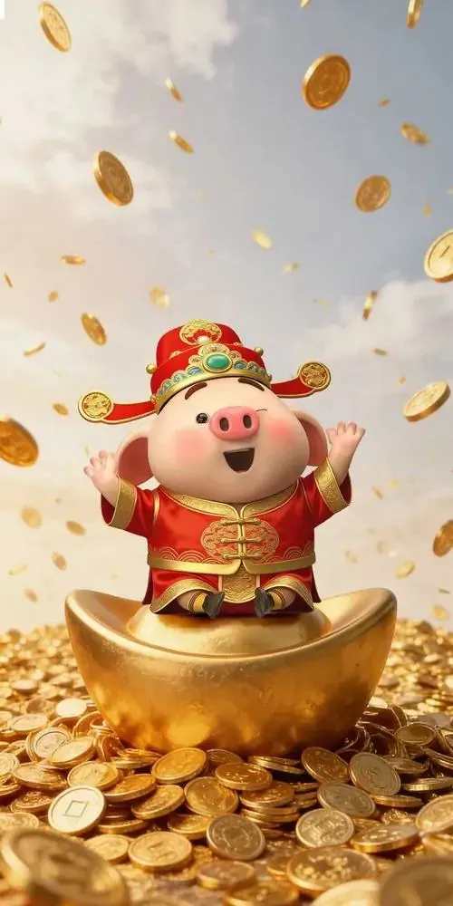 Ảnh bìa may mắn linh vật Hợi ngồi xếp chân trên đài sen vàng, tay cầm đồng tiền cổ và ánh mắt hiền tạo cảm giác bình an, chiêu tài rất hợp làm nền điện thoại