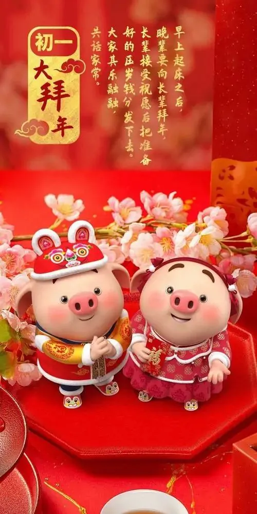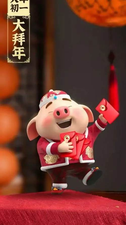 Ảnh bìa điện thoại linh vật Hợi mặc áo dài đỏ đứng chắp tay trước cổng xuân, thân hình tròn và biểu cảm vui vẻ làm khung hình trông đẹp, may mắn và tụ tài