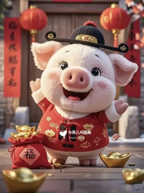 Một chú lợn nhỏ mặc áo tết đứng cạnh hũ tiền xu, gương mặt phấn khởi khiến hình ảnh chú lợn con này trông như lời chúc tụ tài, hút lộc đầu năm