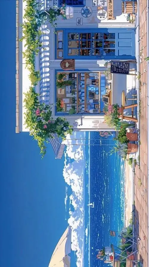 Hình nền manga ngôi nhà xanh trắng hiện lên cân đối dưới bầu trời trong, hàng cây và lan can phía trước khiến bức này gợi đúng không khí thị trấn ven biển