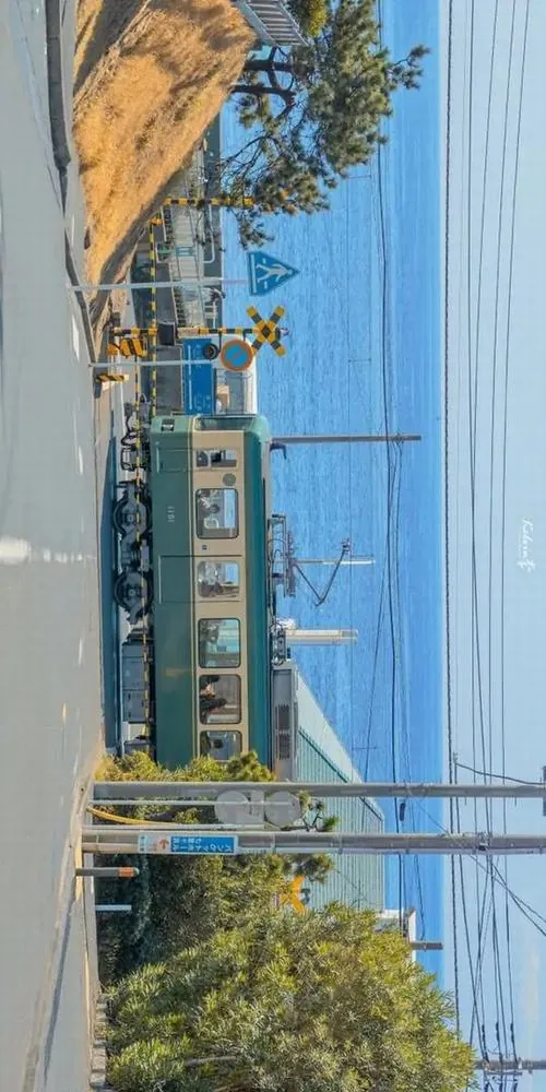 Con phố ven biển hiện ra dưới mái nhà cổ, phía cuối đường là mặt nước xanh và mây trắng cao làm bức ảnh như một ngày hè trong trẻo ở Nhật