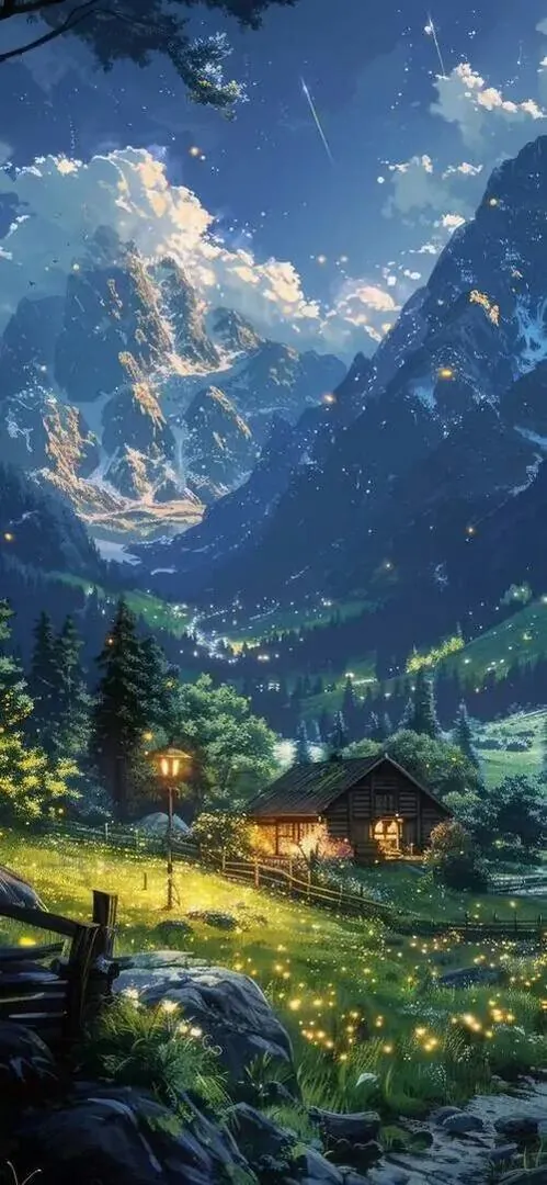 Hình nền dọc thung lũng xanh sẫm nằm giữa núi cao, căn nhà nhỏ phát sáng ở chân đồi làm khung cảnh ban đêm này vừa lạnh vừa có điểm tựa ấm
