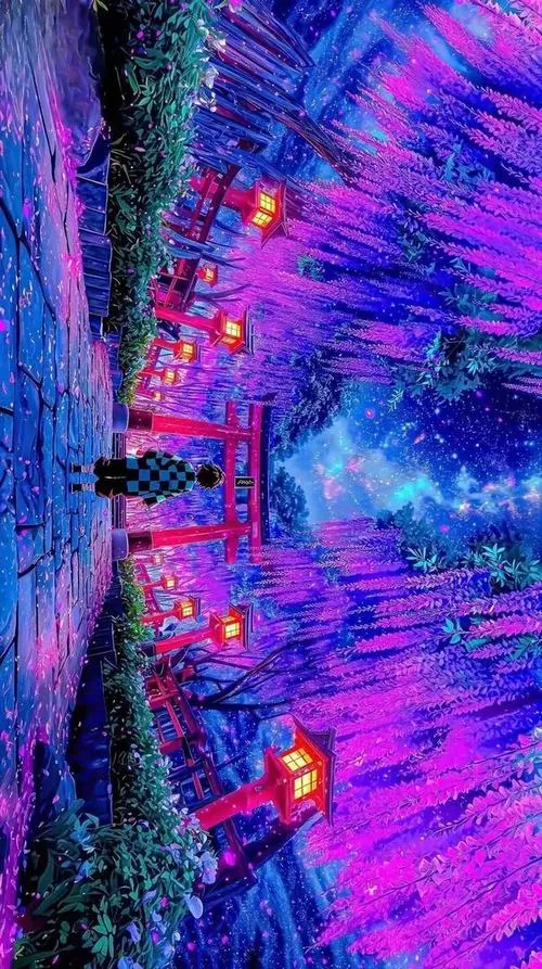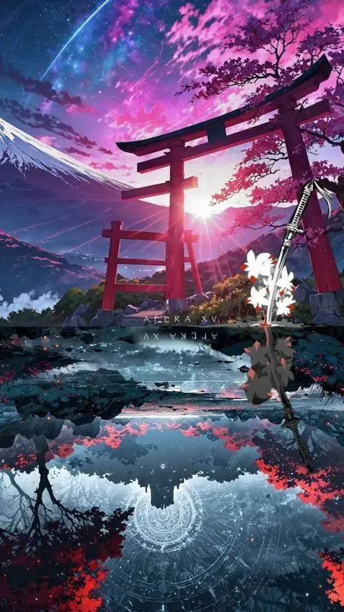 Cổng torii đỏ hiện lên giữa mặt nước phản chiếu sắc tím hồng, nền trời và vệt sáng phía xa làm bối cảnh đậm chất fantasy nhưng vẫn gọn mắt