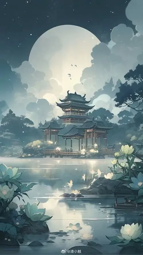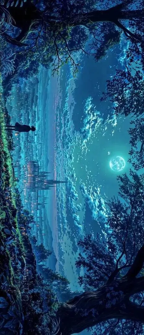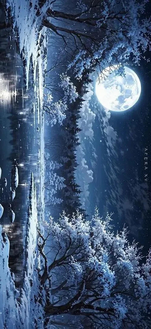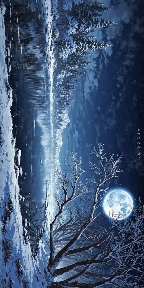 Trăng tròn treo trên khe núi tối, dải nước trắng rơi xuống giữa vách đá khiến toàn cảnh đêm này có nhịp lặng và rất hợp kiểu ảnh nền bối cảnh hoạt hình