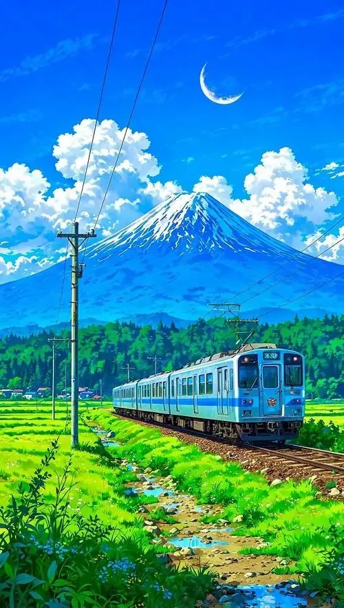 Hình nền điện thoại chuyến tàu xanh chạy ngang đồng cỏ trước dãy núi, vệt mây cong cùng ánh trăng nhỏ làm cả ảnh có chất mơ khá rõ