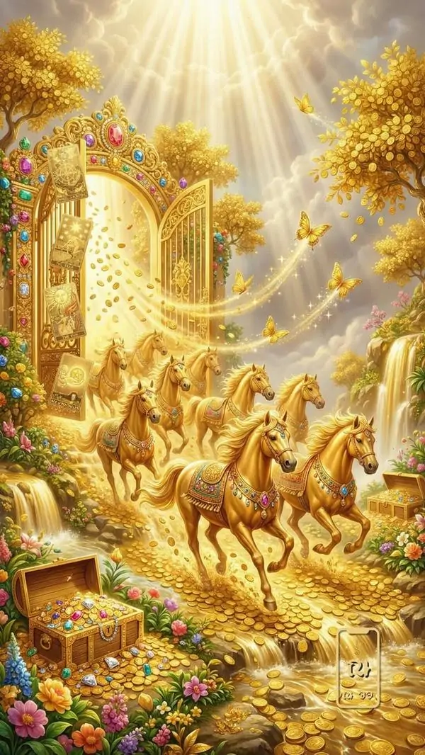 Đàn ngựa màu hạt dẻ vượt qua lớp sương sớm mỏng trên cánh đồng rộng, bước chân dồn dập nhưng đội hình vẫn đều, gợi cảm giác thu hút tiền bạc và hanh thông