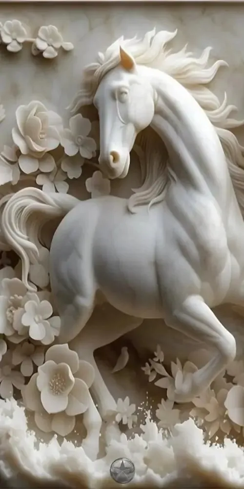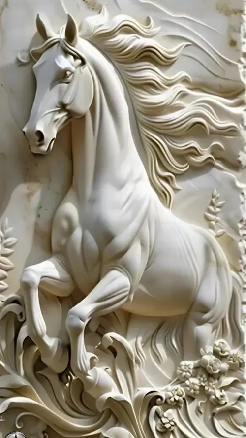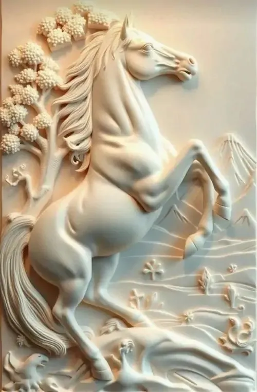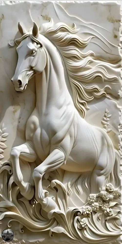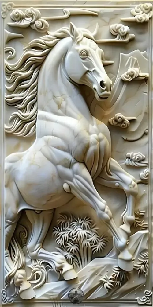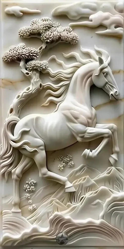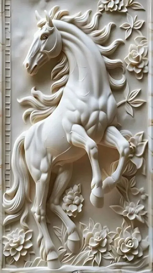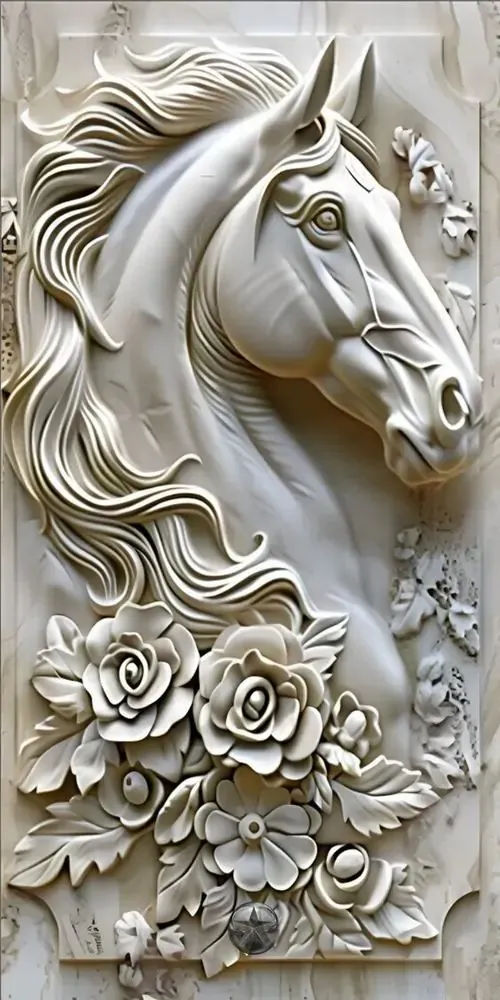 Bức phù điêu con ngựa trắng đứng giữa rừng hoa nở rộ với các đường nét chạm trổ nổi khối rõ rệt giúp không gian số của bạn trở nên sinh động và thơ mộng.