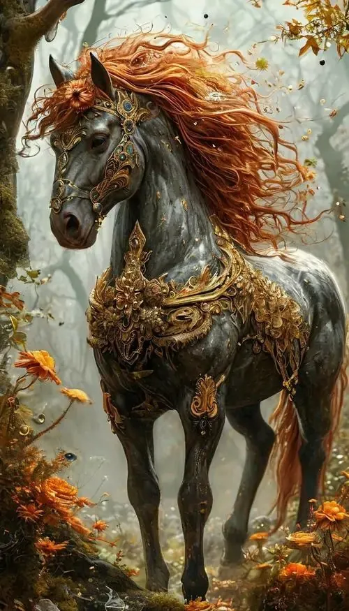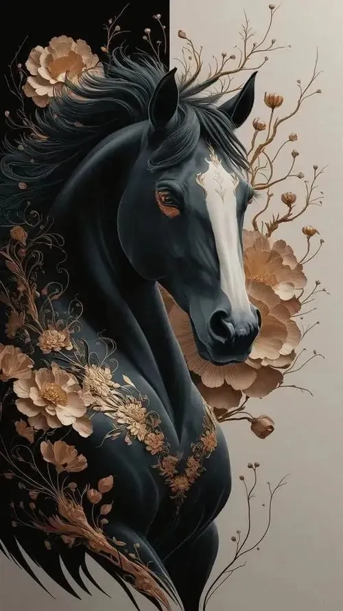 Ảnh wallpaper chiến mã đen huyền bí được trang trí bằng những họa tiết hoa vàng tinh xảo uốn lượn dọc theo cơ thể tạo nên vẻ đẹp đẳng cấp và đầy quyền lực.