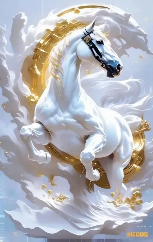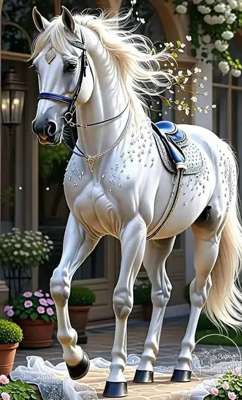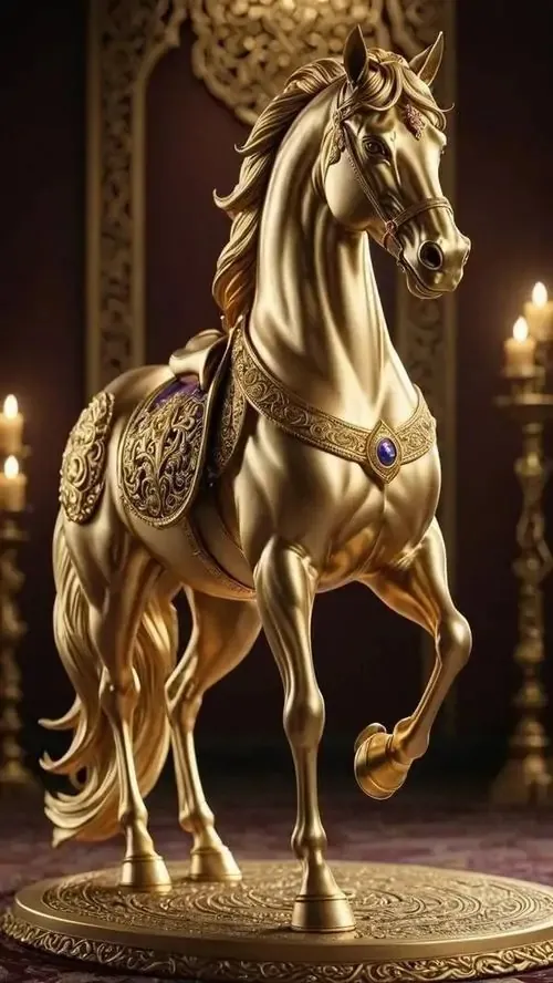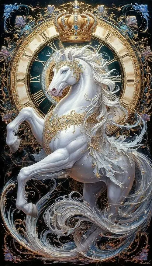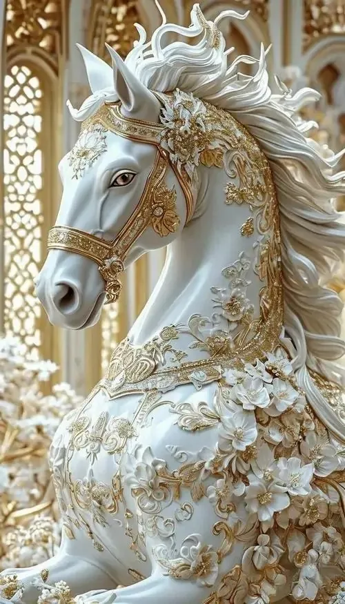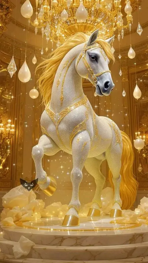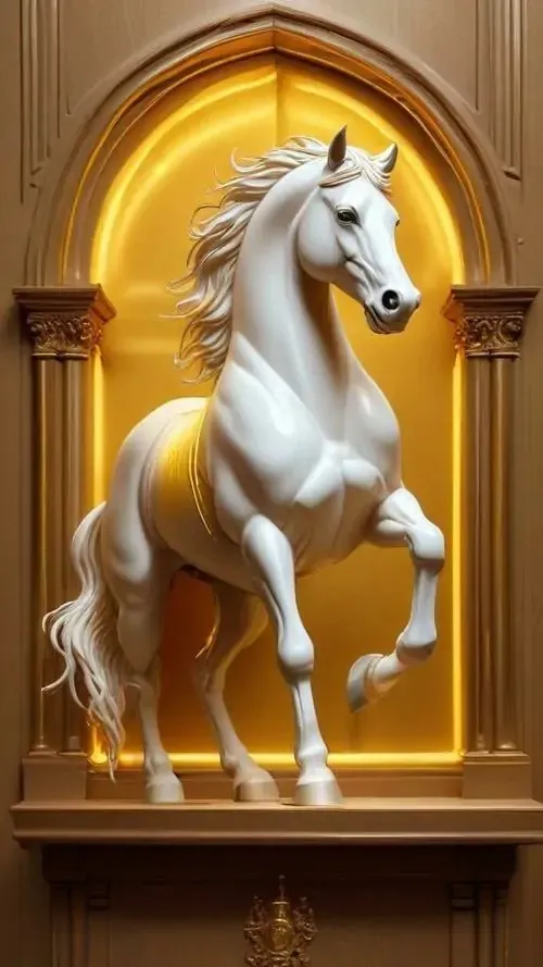 Một chú bạch mã kiêu hãnh đứng bên dưới mái vòm cung điện rực rỡ ánh đèn vàng tạo ra không gian chiều sâu vô cùng lộng lẫy và mang đậm nét quý tộc.