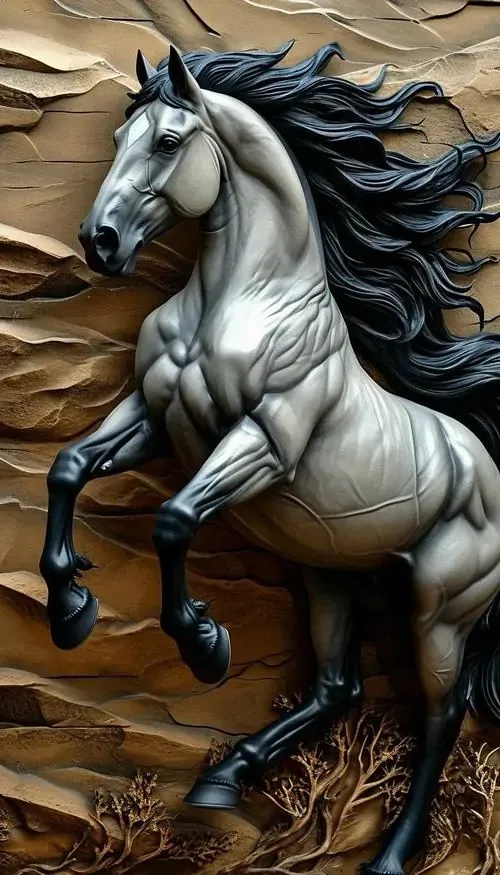 Hình nền chú ngựa trắng tạc nổi trên vách đá xám với tư thế vươn mình mạnh mẽ tạo cảm giác khối nổi 3D chân thực đến từng thớ cơ sống động.