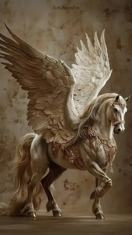 Hình ảnh thiên mã có cánh đứng oai vệ trên nền giấy cũ mang phong cách cổ điển với những đường nét phác họa ba chiều cực kỳ công phu và nhuốm màu thời gian.