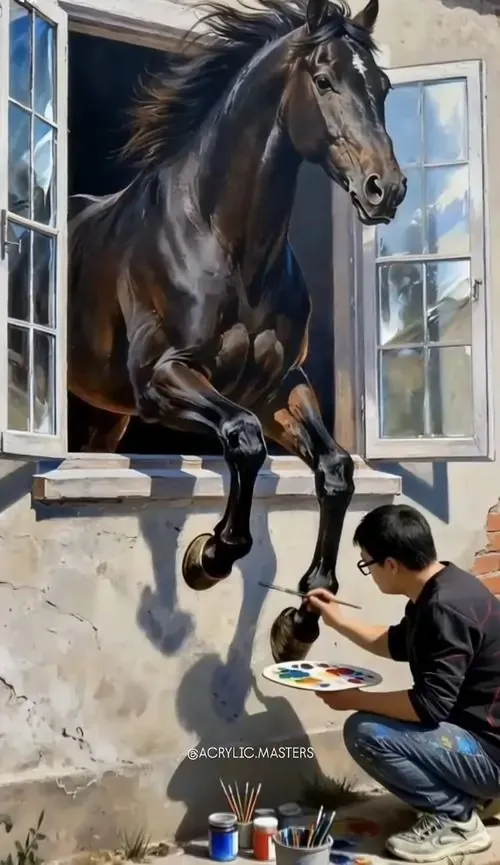 Ảnh nền thực tế ghi lại khoảnh khắc chú ngựa đen thò đầu qua cửa sổ nhìn người họa sĩ đang vẽ tạo nên một bối cảnh gần gũi và vô cùng thú vị cho người xem.