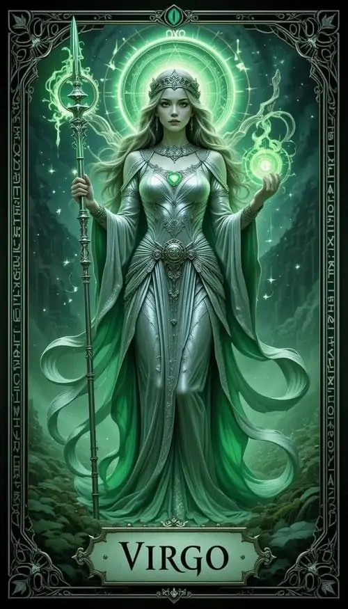 Avatar Virgo hình nữ thần xanh ngọc đứng bất động trong khung bài tarot, áo choàng dài chạm sàn và họa tiết phát sáng khiến tổng thể ngầu nhẹ mà vẫn giữ nét thanh sạch của cung đất
