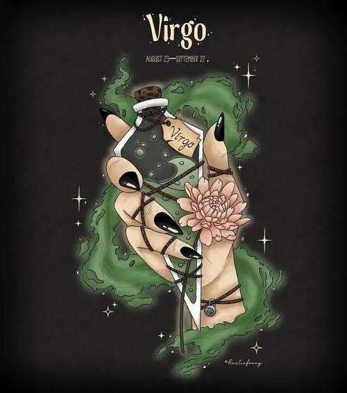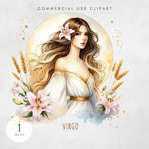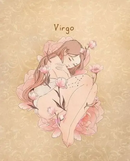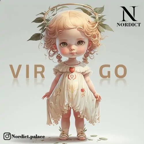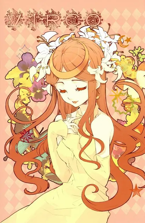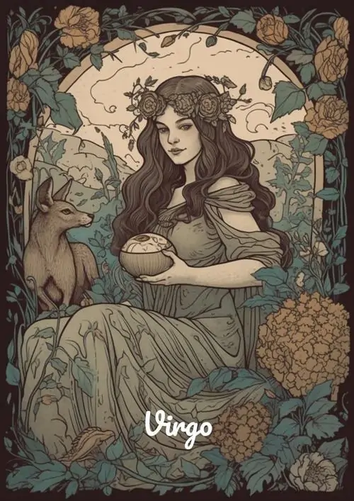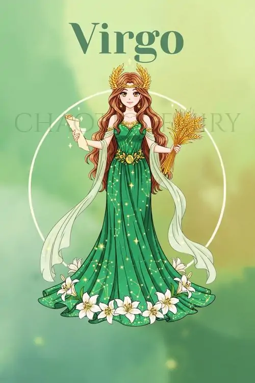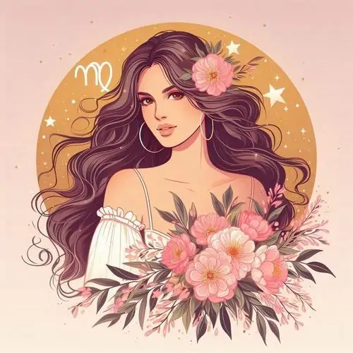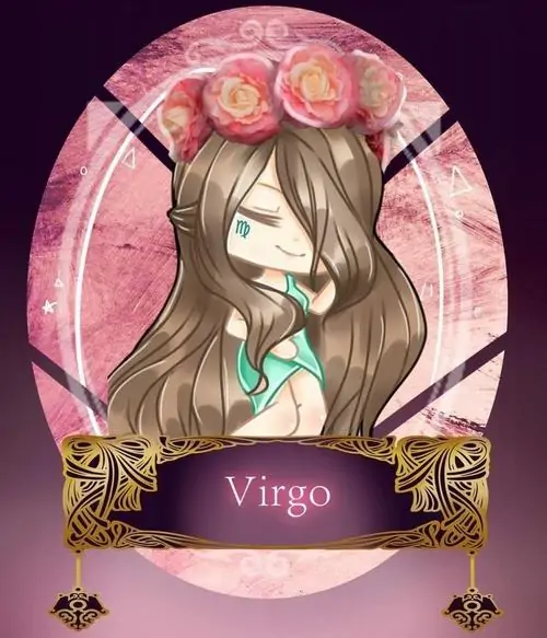 Ảnh chibi chân dung cô gái tóc nâu dài đội vòng hoa hồng, mắt khép nhẹ dưới nền tròn hồng tím và dải chữ Virgo phía dưới làm tổng thể mềm theo lối cổ tích đẹp