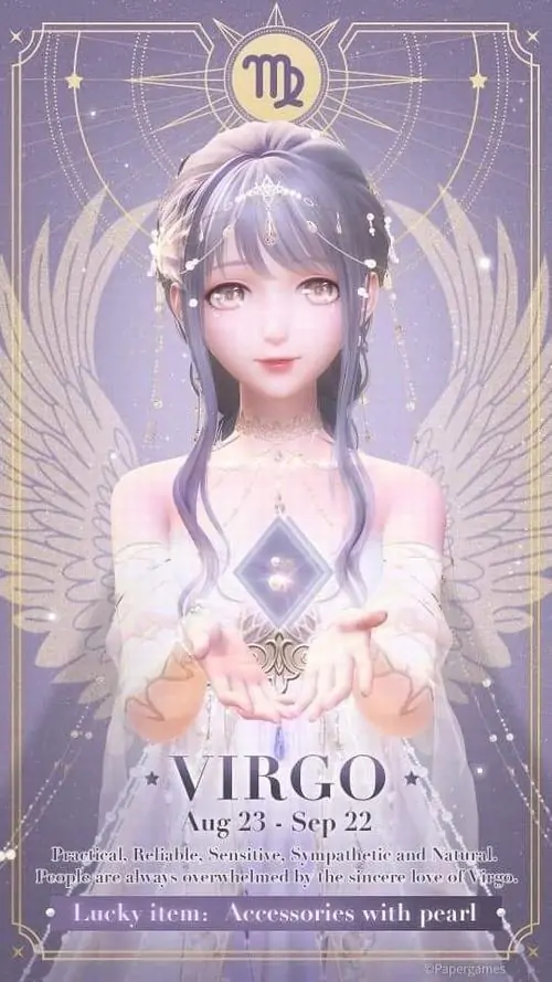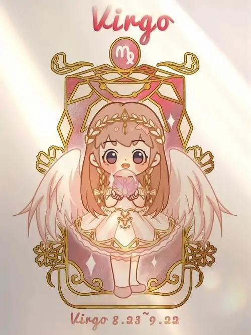 Hình ảnh Virgo bé gái có cánh ngồi giữa khung biểu tượng vàng, mái tóc hồng nhạt xoăn nhẹ và váy kem phủ gọn cơ thể làm ảnh hoạt hình Xử Nữ nhỏ nhắn trông khá sang